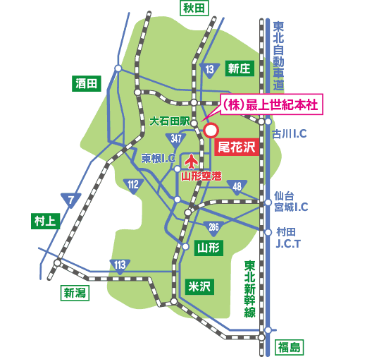 本社工場のある尾花沢市は、山形県の北東部に位置し、豊かな自然ときれいな水に支えらえた特産物豊な街です。山形の中でも雪の多い地域で、冬には2m以上まで積もることもあります。